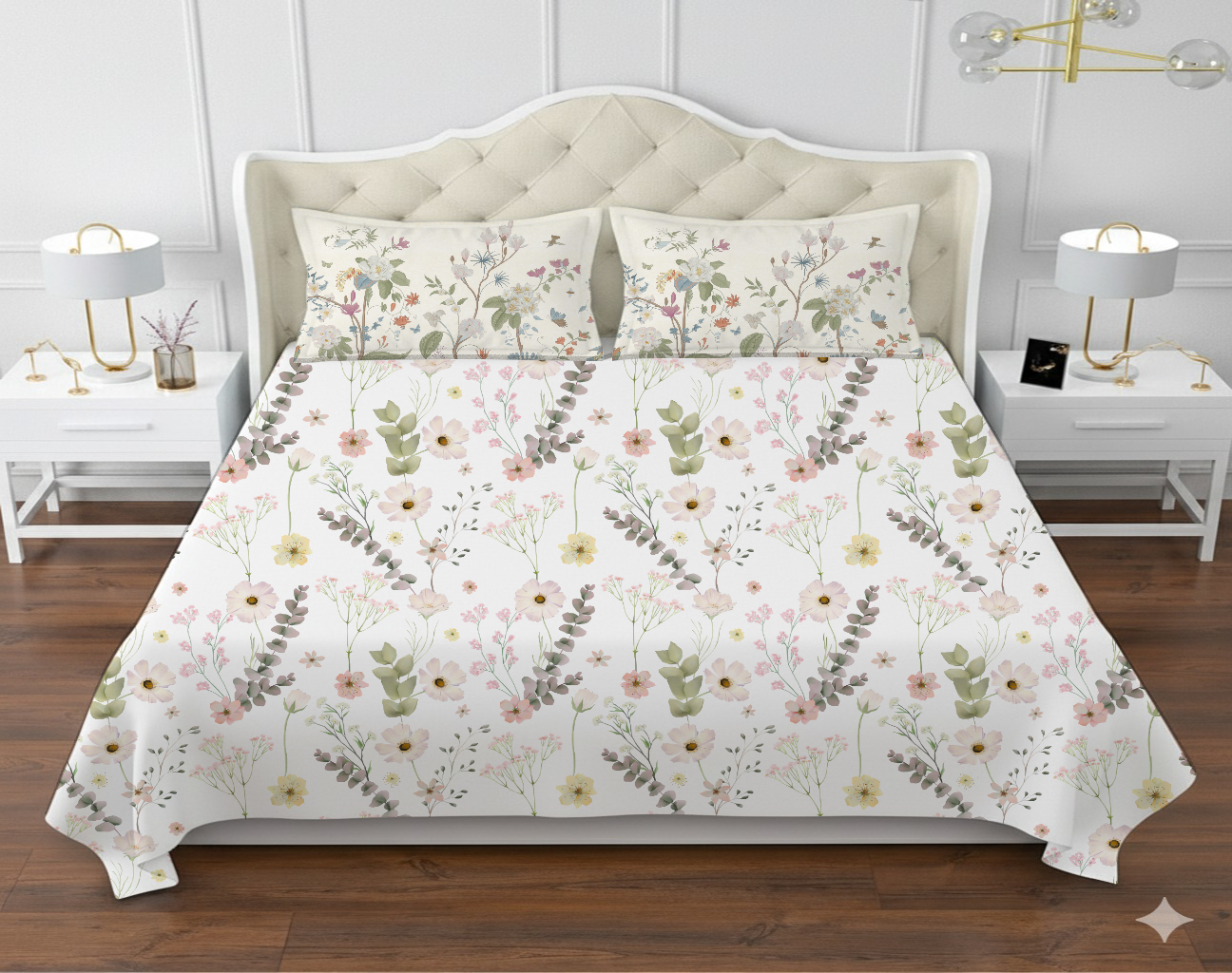 📦 Set Includes – 1 Queen Bedsheet (approx. 90×100 inch) & 2 Pillow Covers